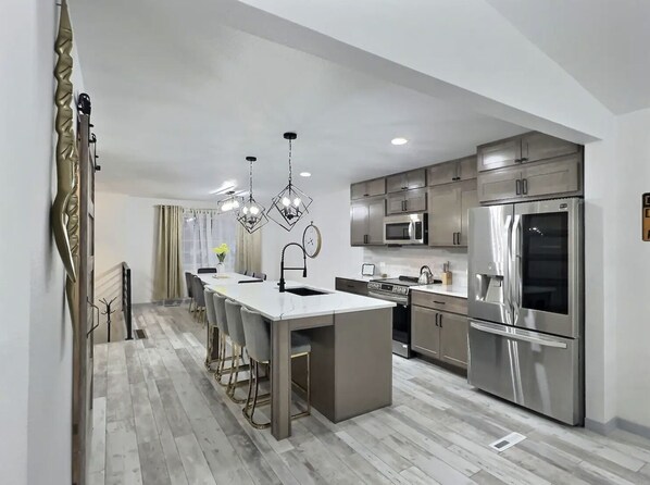Kitchen: Fully equipped kitchen, cooking utensils, spoons/forks/butter knifes, pots and pans, plates, bowls, cups, coffee cups, shot glasses. All stainless-steel appliances. Dining table adjacent to kitchen, and kitchen oversees living room.