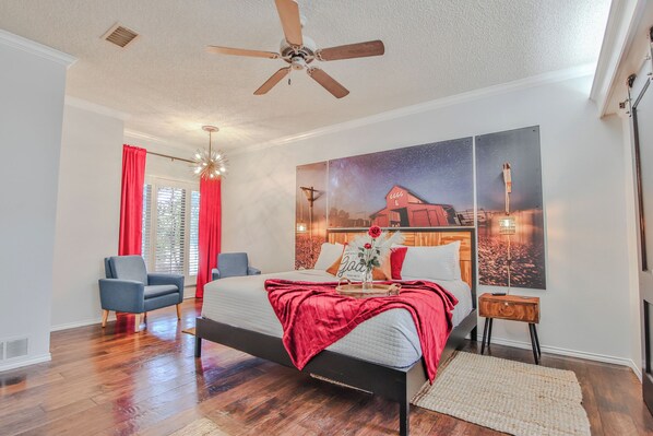 The spacious layout ensures there's more than enough room for everyone to stretch out and find their own perfect spot, whether you’re soaking up the sun by the pool or enjoying a quiet moment in one of the many cozy lounging areas. Our home comfortably sleeps 13 in beds, beginning with Suite 1, the Ranch Room. It boasts a lavish King sized bed, private bath with soaking tub, and stand alone rain shower. The office is positioned perfectly next to the Ranch Room on the 1st floor for worry free toddler sleeping or anyone comfortable on a Full. Suites 2 & 3, the Crop Duster & Harvest Rooms are on the 2nd floor, also equipped with King beds and private bathrooms. Suite 4 on the 2nd floor, the Raider Bunk Room, has a supple Queen sized bed with a Full and three Twin bunks, private bath, sleeping up to 7. Larger groups can inquire about additional sleeping accommodations.