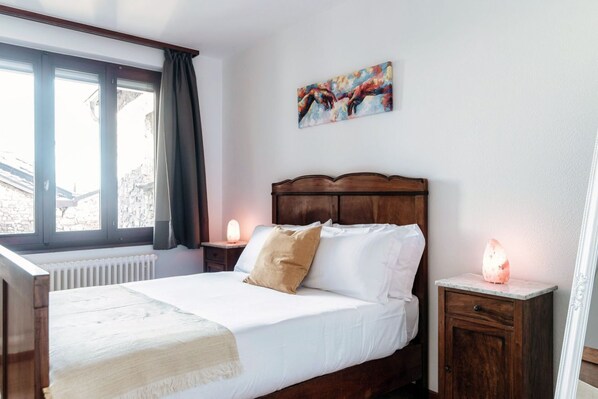 On the upper floor, the house offers three spacious bedrooms with wooden floors—two with double beds and one with a single bed—all featuring wardrobes or coat racks for storing clothes and personal belongings. The large bathroom, with its classic touches, is complete with a bidet and a bathtub.