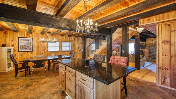 The open living space is perfectly laid out for guests to enjoy spending time together. Gather around the stone fireplace to create memories or watch a movie or the big game. You'll flow right into the fully equipped kitchen with granite counter tops and stainless-steel appliances, perfect for preparing your culinary favorites!