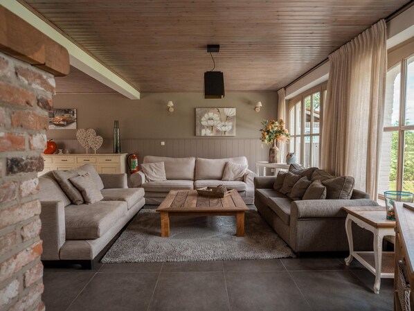 Hidden among the grass is this beautiful rural holiday home. It offers luxury and comfort mixed with a country style. Plenty of space for the children to play and various places to socialise, such as the living room, the bar or the terrace. The kitchen is fully equipped and after an active day you can completely unwind in the sauna. What a dream!