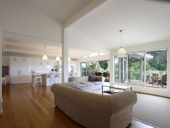 Det største soverommet med king size-seng og ensuite ovenpå, nede to soverom med queen size-senger og det fjerde soverommet med 2 enkle sett med køyer. Kjøkken med alle moderne bekvemmeligheter. Bi brett dører ut mot både foran og bak dekk.