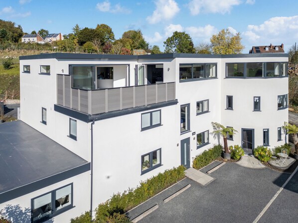 Modern home across one floor, sleeping 10 guests (plus leather sofa bed) in an exclusive development. Luxurious interiors with a sociable layout. Views of the Malverns from the hill gardens and spacious grounds for relaxation.. Ramp to entrance.