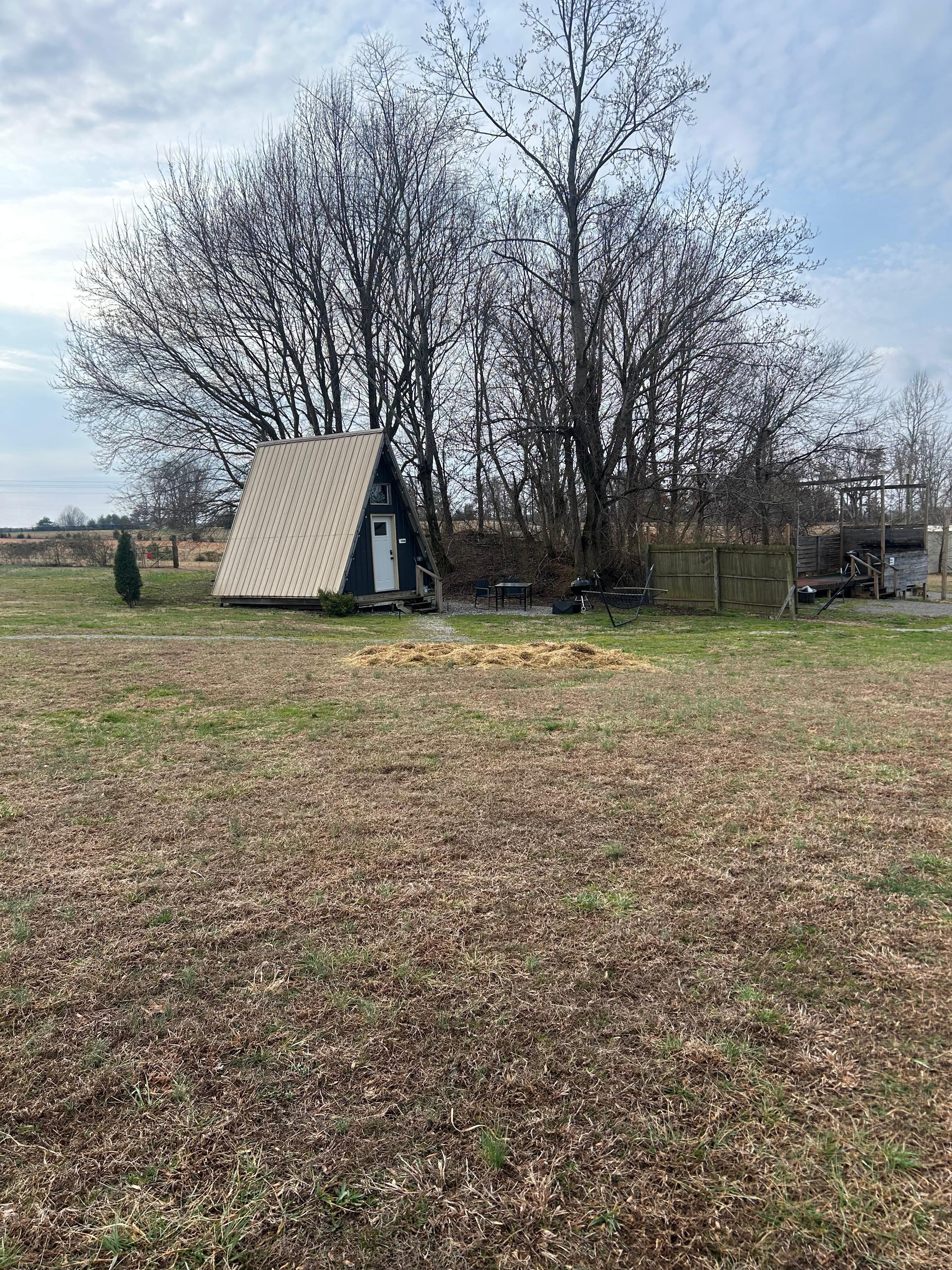 Glamorous camping at its best in this cute and cozy Aframe. Climate control with AC and heat. Mini fridge, microwave, coffee keurig, towels, paper products. Outside a table, fire pit, charcoal grill complete your camping experience. Campground bathrooms are close by. Birds to wake you in the morning and friendly farm animals are always looking for treats.
