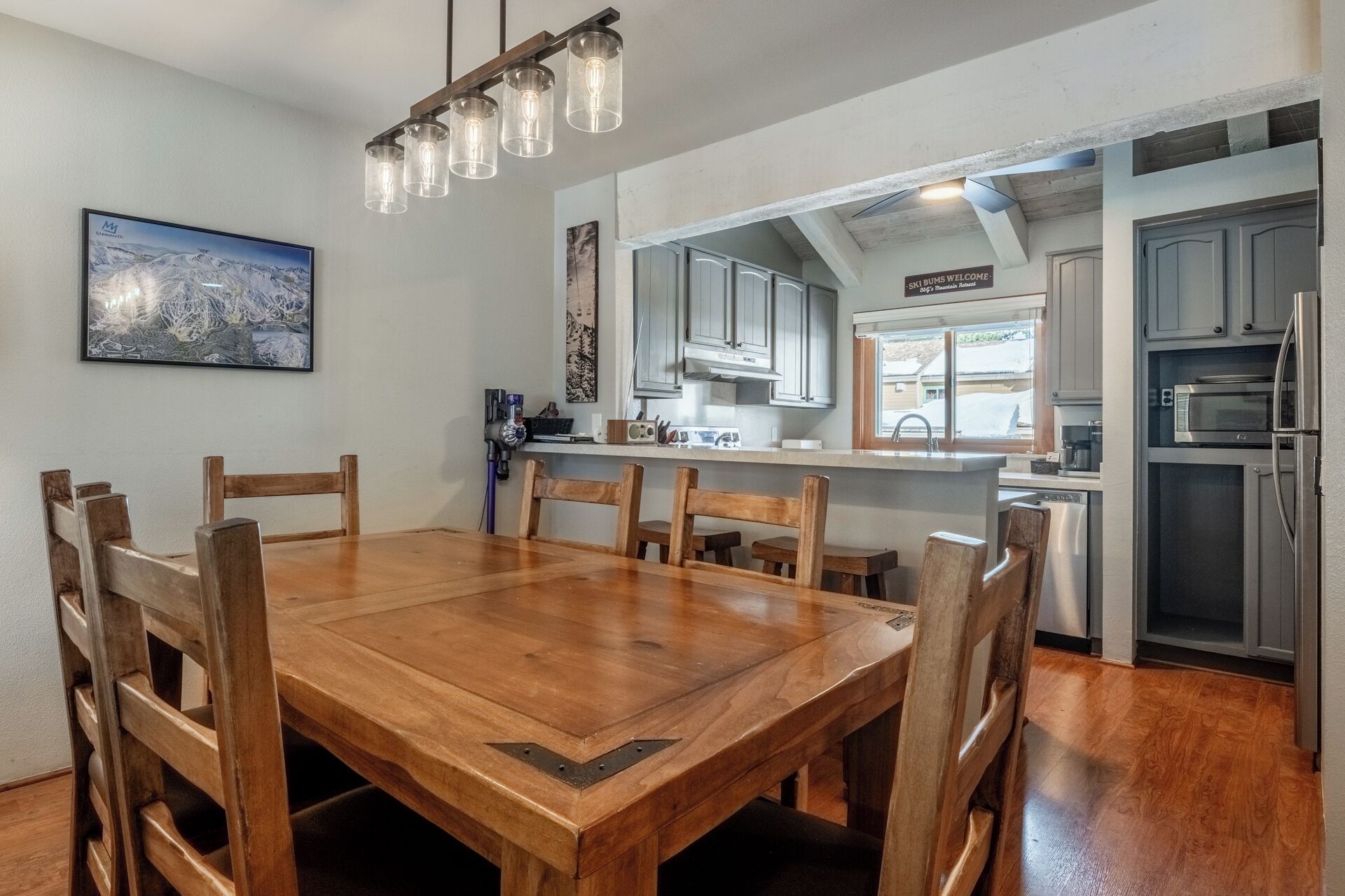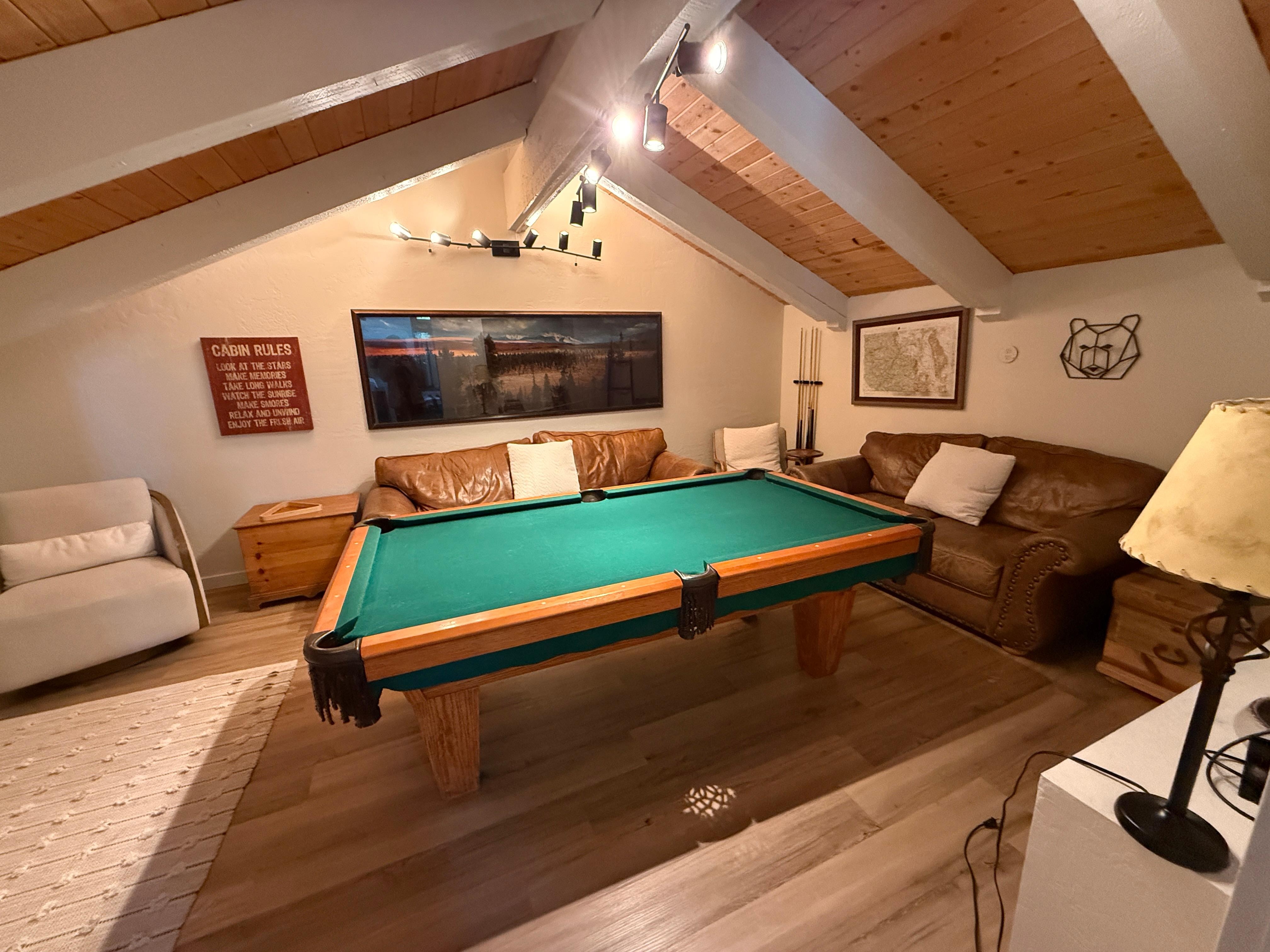 Denne leiligheten har alt for en perfekt Mammoth-getaway! Nyt en fantastisk, fantastisk fjellutsikt fra nesten hvert eneste vindu i denne leiligheten. Soaring 20-fots tak ønsker deg velkommen til en åpen stue + spisestue + kjøkken. Alle nye møbler, maling og teppe inviterer deg til å slappe av og nyte utsikten. Denne romslige enheten i øverste etasje tilbyr 2 soverom med king size-senger + hems soveområde + spillrom! Kjøkkenet er fullt utstyrt med alt du trenger for å lage måltider hjemme. Den splitter nye sofaen er det mest komfortable stedet å sitte og slappe av etter en lang dag på ski! Leiligheten er utstyrt med rikelig med sengetøy og håndklær for hele gruppen med en vaskemaskin og tørketrommel i leiligheten for gjestebruk. Veldig familievennlig. Gjemt i skapene og hulen finner du en treportal barneseng med ekstra laken og dyna, barnestol, pakke og lek, babyport og en bøtte med leker. Underetasjen har et romslig hovedsoverom med tilstøtende bad. Det andre soverommet med king size-seng med andre bad i nærheten ligger også i hovedetasjen. Hvert rom i hjemmet har nye flatskjerm-smart-TV-er med Netflix. Den store flatskjermen over peisen i stuen har en smart-TV og har også en kabelboks. Ovenpå loftet har 3 fulle senger, 1 sett med køyesenger (full over full) pluss en annen full seng. I hiet / spillrommet finner du komfortable skinnsofaer, biljardbord, brettspill, kort, puslespill og et sammenleggbart bord for kortspill. Dette leilighetskomplekset har noen av de best vedlikeholdte eiendommene i hele Mammoth. Et vakkert basseng med utsikt over Sherwins, 2 dype badestamp og badstuer. Begrunnelse tilbyr asfalterte turstier, utendørs felles BBQ, benker du kan glede deg over å se på og lyden av bekken. Komplekset tilbyr 2 boblebad, badstue, basseng om sommeren, grillplass og tennis! Du vil absolutt elske beliggenheten på bekken. Slipp en linje inn og fang en fisk i hagen din! Ligger på pendelruten som tar deg opp til bakken eller til landsbyen på få minutter. Mange fantastiske sykkelstier i nærheten og den lokale barneparken ligger rett ved siden av komplekset! Det er så mye å glede seg over her at vi vet at dette vil være din nye reise til sted å bo i Mammoth!