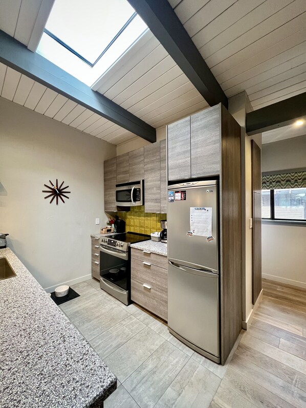 The open living area feels grand with high vaulted ceilings, expansive south facing windows and sky lights, and new hardwood oak flooring throughout. In the living room, there is a comfortable sofa, large flatscreen TV with basic cable and steaming/smart features, central heating and wood burning stove providing the perfect ambiance for all seasons. Off the main living area is a private patio to enjoy the fresh mountain air, with a free supply of firewood. The kitchen has been fully remodeled, with new cabinets, stainless steel appliances, and quartz countertops. The kitchen comes stocked with everything you need to cook a nice meal. There is a dining room table with seating for 6, and breakfast bar seating for 3.