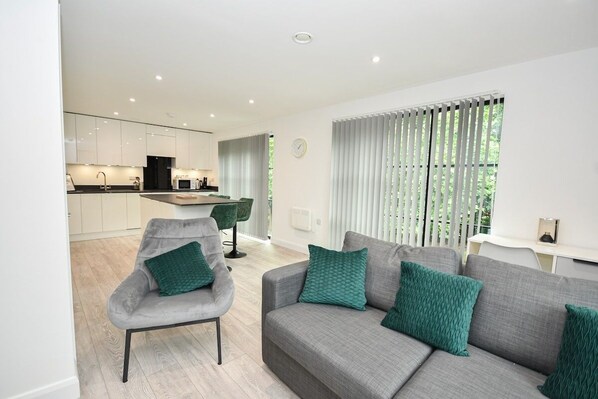 Living Area: sofa bed, 55-inch smart TV, blackout curtains, and stylish feature wall.
