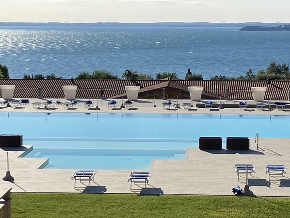 Stuen har en vakker terrasse med hagemøbler og solgardiner. Herfra har du en fantastisk utsikt over Gardasjøen, Sirmione og det felles svømmebassenget på feriestedet. Alle rommene har også balkong, balkongen på soverommet har også utsikt over innsjøen.