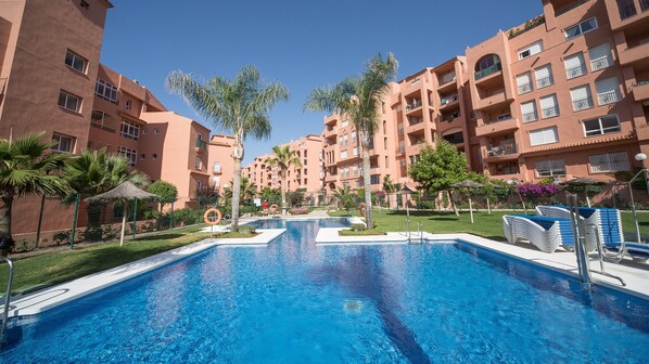 2 Bedroom Beachside leilighet med utsikt over Pool & Palm Trees On New Golden Mile