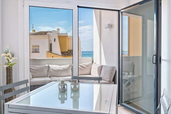 The apartment offers 2 bedrooms, a bathroom, a cozy terrace with lounge area and partial sea views, fully equipped kitchen with high tech home appliances, and a spacious living room. Sleeps as standard 4. The living room is divided into a seating, cooking and dining areas. The dining area sits 4 and is found in front of the glass doors leading to a terrace. The seating area has a large sofa and flat screen TV. The ceiling is backlighted by colour changing LED lights with remote control. The kitchen has everything you need for preparing your meals, as cookware, glassware, utensils, oven, stove, fridge, dishwasher, microwave, coffee machine, electric kettle and toaster. From the kitchen and the living room you have an access to a marvelous terrace, with comfortable sofa, where you can enjoy your coffee contemplating fantastic partial sea views. The master bedroom offers a king size bed and a spacious built-in wardrobe. The second bedroom has a trundle bed. The bathroom is equipped with a walk-in shower, sink, WC, washing machine and dryer. The complex is secure and offers multiple services, as a free secured parking, two shared swimming pools, for kids and adults, only for residents, hair dresser, restaurants, children´s playground and a direct access to the beach. On the beach, you can find water sports activities and entertainment for kids, sunbeds and umbrellas available for rent, bars and restaurants. You will have all amenities, like restaurants, supermarkets, shops, etc., on a short distance. Also, the city provides all types of entertainment, like golf camps, hippodrome, water sports on the beach, shopping centers, cinema, and many activities in other villages nearby. Baby cot and high chair on demand Airport transfers available on demand Air conditioning throughout Wifi Parking The beautiful port of Cabopino and its boat marina abounds with many restaurants of all nationalities... Chinese, Spanish, Italian and English.... the famous "Albert's on the Dock", is a must for at least one evening meal as you will appreciate its stunningly exotic interior.