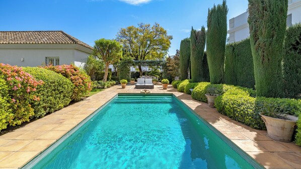 In the meantime, you might be swimming up and down in the sophisticated Andalusian pool, laughing at the alfresco dining during a wholesome barbecue with friends, or getting some shut-eye in the outdoor lounge. Surrounded by pine trees, stone benches and plants, the swimming-pool resembles traditional Moorish fountains. Some of these can still be found in majestic architectural pieces such as the Alcazaba in Málaga, or the Alhambra in Granada. The only difference is, the one in Guadalmina Golf Front Villa is for your private use and comes with loungers.