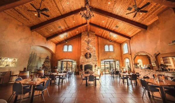 Du kan nyte guidet vinsmaking eller nyte rustikke vedfyrte pizzaer eller en multi-retters vinparret kokkens meny i bistroen.