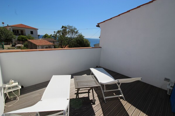 En praktisk trapp fører til øverste etasje med soverom, åpen til resten av huset, og en vakrere bad med like hytta Crystal dusjhode. Fra soverommet du inn den store solterrasse i første etasje hvor du kan nyte havutsikten. Terrassen for sin sørpå, egner seg spesielt i lavsesongen i solen, beskyttet fra nord vind.