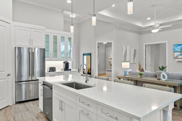 Aspiring chefs will be delighted with our state-of-the-art kitchen, equipped with modern appliances, a roomy layout for easy meal preparations, and stunning countertops adding a touch of class. Choose to savor your meals at the stylish dining area indoors, or enjoy the refreshing ambiance of al fresco dining on the screened lanai overlooking the pristine pool.