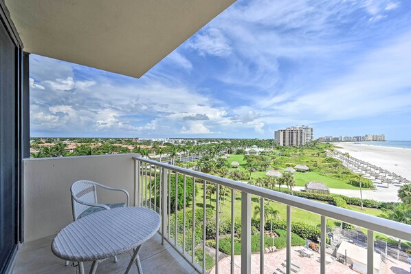 Gjesterom med airconditioning på Beachfront Marco Island Condo w/ Pool Access! har strykejern/-brett og takvifte. Rommene har balkong. Gjesterommene ved denne leiligheten med 3 stjerner har kjøkken med komfyrtopp, mikrobølgeovn, gryter og panner/tallerkner/kjøkkenutstyr og oppvaskmaskin. Badene har badekar eller dusj.