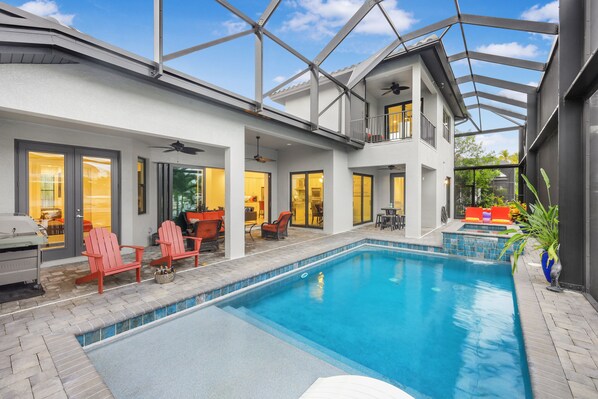 The lanai is surrounded by a stunning waterway, offering a palm-framed view of turquoise waters. Take a refreshing swim in the heated pool, then fire up the gas grill for waterside dining at its finest, enjoying your meal at the shaded outdoor table cooled by an overhead fan. As the day winds down, relax on a myriad of sun loungers and chairs, sipping a tropical drink as the setting sun paints the sky in brilliant shades of orange.