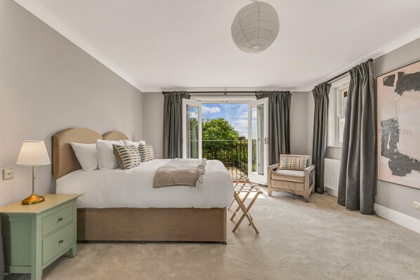Upstairs, the master bedroom makes for a calm and inviting space, with French doors and a Juliet balcony overlooking the garden. The master bedroom’s en suite is equipped with a roll top bath, separate rainfall shower and his and hers sinks.