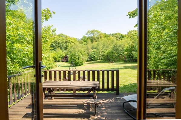 Outside, enjoy a private deck, picnic bench, and a BBQ firepit with an adjustable grill, surrounded by four wooden mushrooms to sit on.
