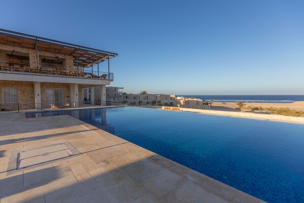 Hotell ved stranden med utendørsbasseng og hvit sandstrand