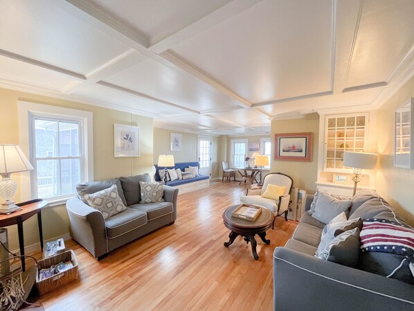 Beautiful antique details, fireplaces, parlors, sitting rooms, huge living room, charming 3rd level look out, natural light pours in illuminating the high ceilings & oversize rooms. Incredible out door space, lush terraced gardens, tool shed, brick patio, steps to meander through the lilies. Sit on the front porch over looking the awe inspiring Atlantic Ocean and all it's beauty as the boats sail by. Front row to incredible sunrise & sunsets, screened in porch.