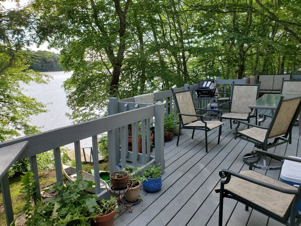 Spectacular waterfront four-bedroom retreat, is only 35 feet (11 meters) from the lake. The house has new central air conditioning and heating. Located in Mashpee, this waterfront cottage that is close to beautiful beaches, nature trails, great options for take out restaurants, and bike trails. Boat (kayak and canoe are available for your use), bike the amazing bike paths nearby, or relax and relax on the spacious deck and enjoy great views of lake! Santuit Pond is approximately 176 acres and an active herring run, connected to the Quashnet River. The Quashnet River flows into Waquoit Bay. Kayaking, and canoeing (life jackets are provided) is amazing. Outside there is a outdoor shower with an indoor bench with a privacy door and latch. Surrounding the house are beautiful gardens, rustic fire pit, restful woods with native beech trees, and outside sitting areas. The deck is large, freshly repainted, with a large table for outdoor eating, and lots of comfortable seating. There are two grills, propane and charcoal, available for your use. The cottage is cozy, quiet and has beautiful views of Santuit Pond from the dining room, four bedrooms, kitchen, and two bathrooms. The house is comfortable with a living room with a large new tv, dining room, which provides truly stunning views of the pond, and a well-outfitted kitchen. The kitchen includes everything you might need for meal preparation, including an air fryer, blender, and a keruig and coffee perculator. Three bedrooms have stunning views of the pond. Several bedrooms have blackout curtains, that are perfect for a good night's sleep. Kayaks and a canoe are available for guests to use. This location is a birdwatchers paradise. There are great blue herons, mute swans, a variety of ducks, ospreys, hawks, owls, egrets, Raised bed gardens offer vegetables, and flowers, alongside the cottage. Swimming in the pond is not recommended, as the pond is not deep, and can have algae blooms at times. If you are searching for a very comfortable, but cozy place to stay while you're exploring Cape Cod, this is your place!