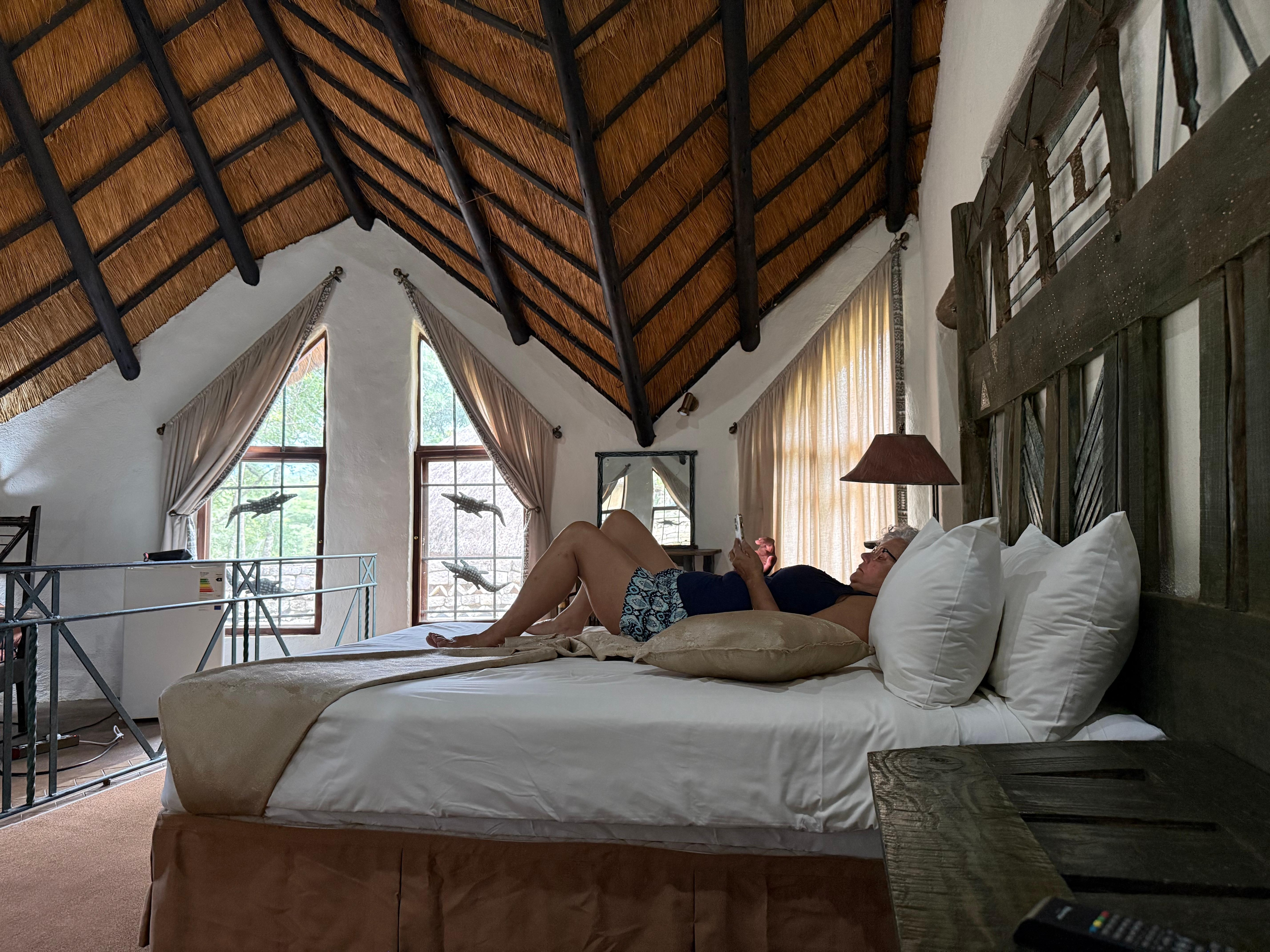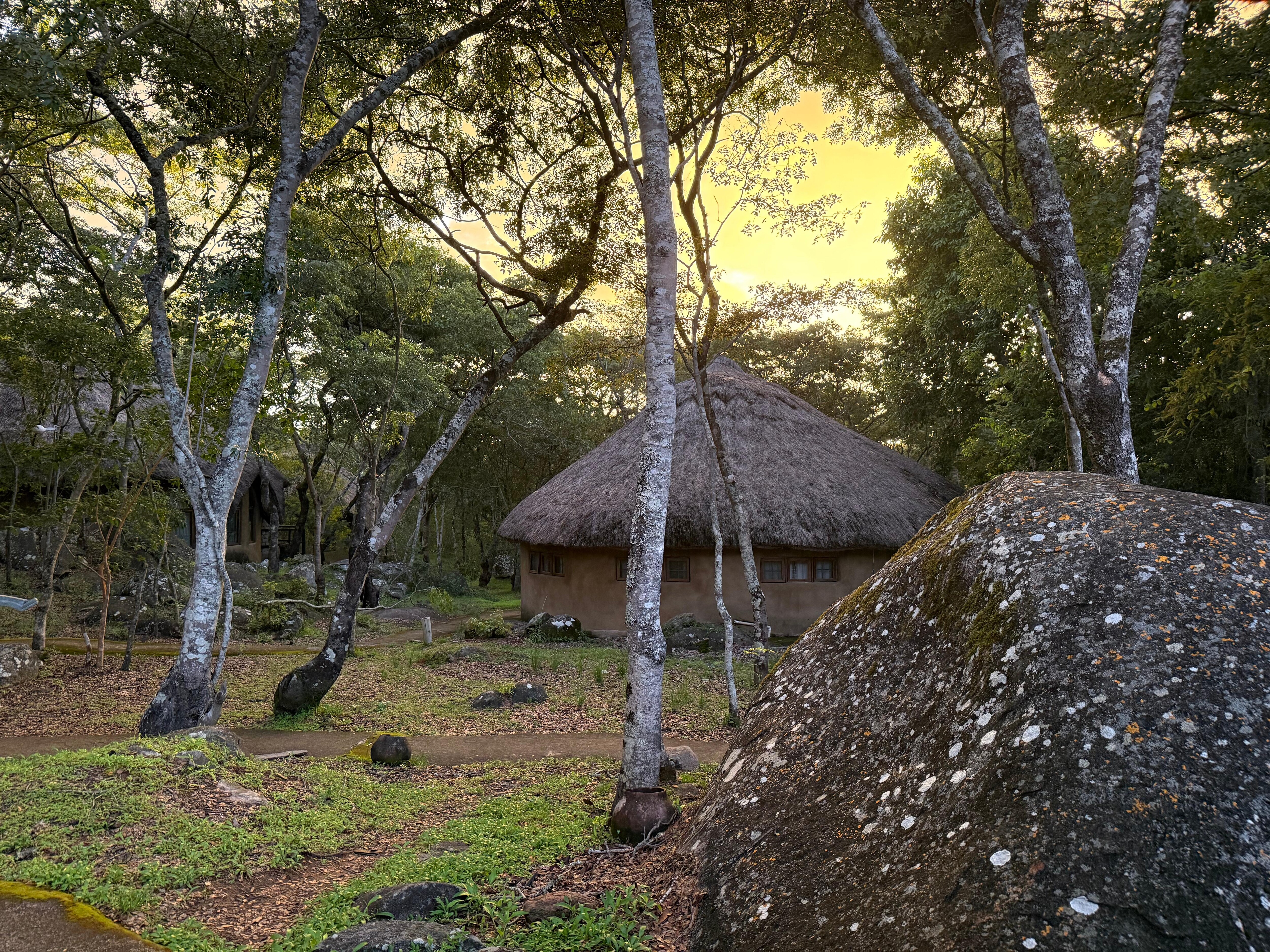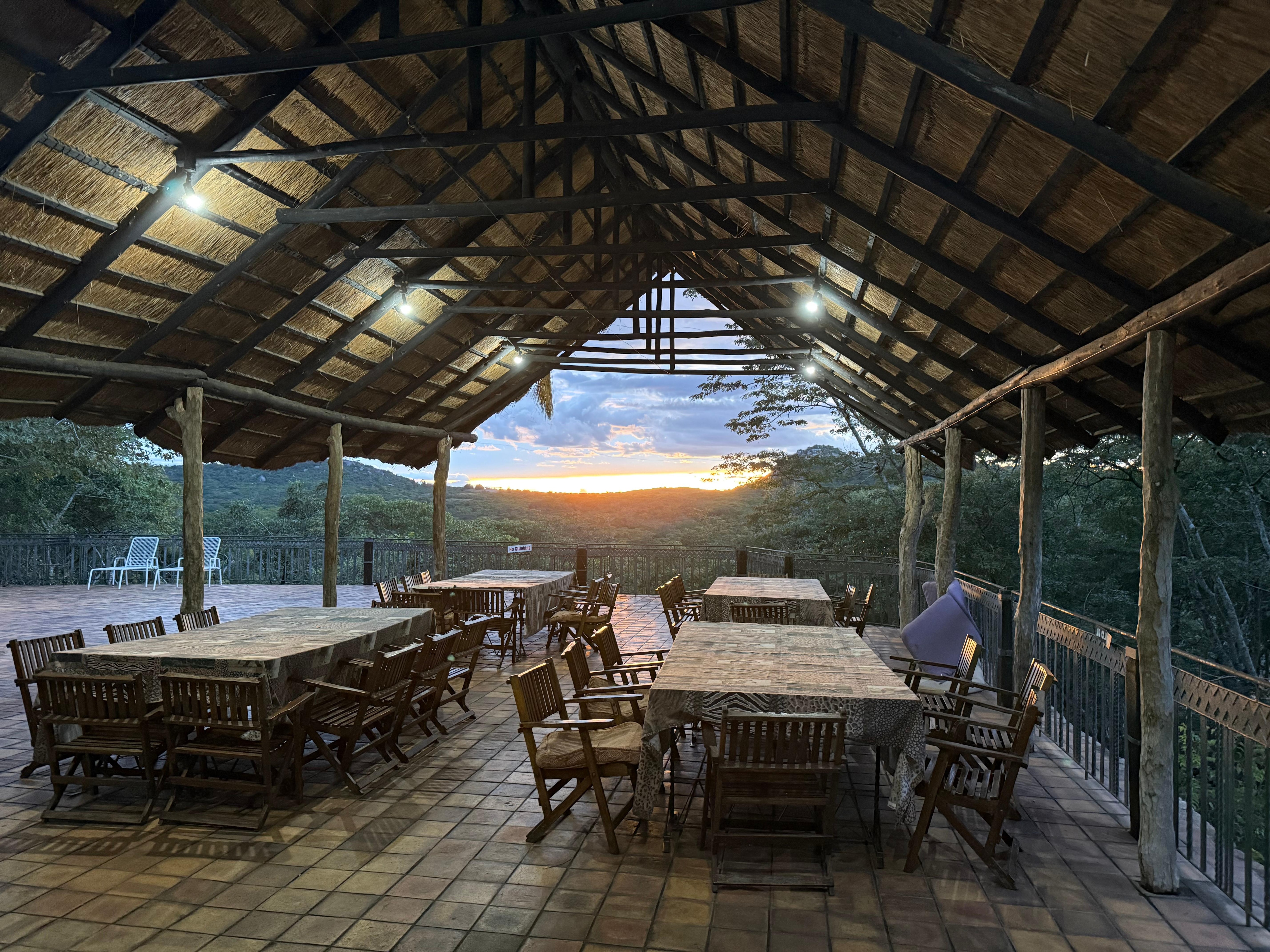 This lodge is amazing. If you were to build a castle in Africa, it would be like this. This establishment is on the scale of European castles but in an African style - made to mimic the nearby Great Zimbabwe ruins. The architecture is impressive with its high ceilings and everything on a grand scale, with many stone walls built among the boulders that are characteristic for this part of the country. Even the individual rooms are palatial in size. We chose to eat dinner at the lodge's restaurant on the night we stayed there. It was a bit pricey but in line with what you would pay at a higher-end lodge like this. However, the atmosphere of the restaurant was a bit awkward. It was in a huge room, and our family wasn't sure if we should engage in conversation because the atmosphere felt like we had to be hushed. The service was excellent, but the wait staff hovered in the corner and watched us while we ate - kind of creepy and part of why we didn't want to talk much (we felt like they were listening to everything we said). The general manager greeting us a couple times and wanting to engage in conversation was a bit too much and added to the creepiness factor of the staff here. This place has great amenities and spaces - a swimming pool, indoor and outdoor bar areas for watching the sunset, seating areas inside and outside in the rooms. The only thing lacking seemed to be the choice of stations on the TV.