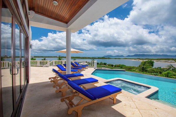 The sunken living room, with its beautiful vaulted hardwood ceiling, overlooks the pool and the ocean. With postcard-perfect views of the lagoon, the Caribbean Sea, and neighboring St. Martin, this villa redefines a luxury escape.