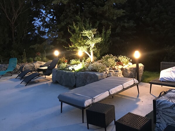 large private swimming pool, illuminated and secured to NF standards with deckchairs and garden furniture and a space where you can sit down for your meals