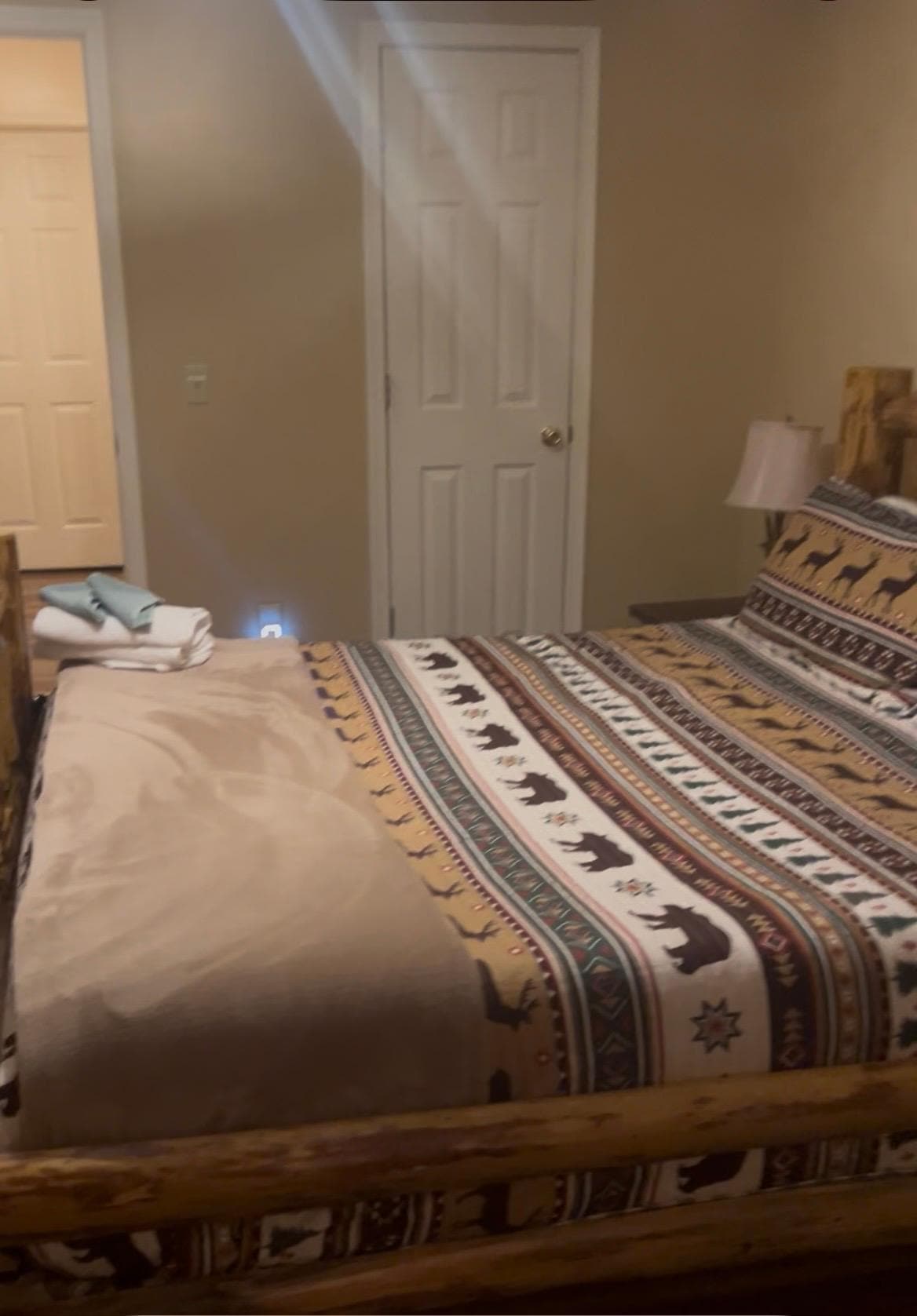 Bedrooms: Three private bedrooms with real log bed frames and comfortable mattresses and bedding and ample storage space in closet and dressers.