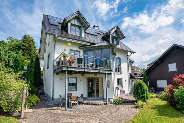 Our lovingly furnished vacation apartments are situated on a fantastic south-facing slope at the foot of the Pön with its 745 meters of altitude. Nature, mountain bike and hiking enthusiasts will find ideal conditions here. You can start your tours directly from the house into the beautiful landscape. The village of Düdinghausen is centrally located between Winterberg and Willingen with their attractive leisure facilities. Winter sports enthusiasts can also enjoy themselves there, whether tobogganing, alpine or classic cross-country skiing. Other excursion destinations in summer are the Diemelsee, Edersee or the Hillebachsee with its water ski facility. Parking is available for our guests directly at the house. Lockable storage facilities for bicycles are available. WLAN can also be used free of charge. Pets are only allowed in the Garden apartment on request (extra charge).