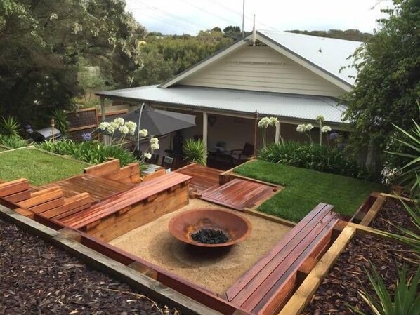 Huset er designet med utendørs levende i tankene. Begge ende soverom og stue har franske dører som åpner ut mot verandaen. Dette fører til utendørs terrassert underholdningsområde på baksiden av huset, utstyrt med en tømmerinnstilling, paraply og gass BBQ.