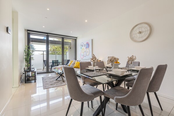 You have 2 Trams going NS and EW within 1 min walk. There are numerous restaurants within a 2-5 min walk from the apartment and a handy supermarket 2 min walk away.