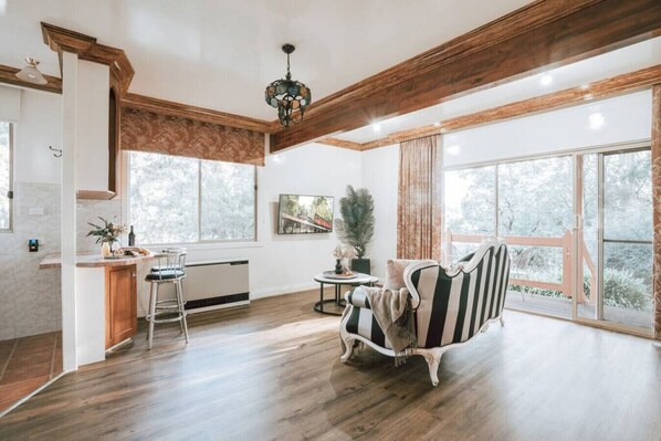 Great for a romantic getaways, relaxing holiday, retreats or business events. Being in the heart of the Dandenong’s means you don't need a car. Walk to Olinda or Mount Dandenong villages, explore the National Parks walks and walking trails. Within 15 minutes there is Sassafras, Puffing Billy, Wineries and the Yarra Valley.