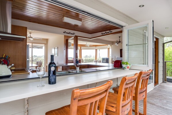 Fullt utstyrt kjøkken med bar til utsiden baksiden dekk og spisestue åpner ut til forsiden dekk.