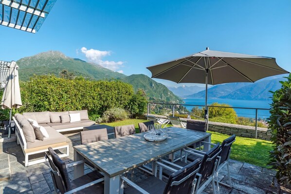 Utenfor kan familie og venner nyte den vidsträckte innsjøutsikten og solskinnet fra sin egen private hage. Delvis terrassert med en plen, gjør hagen gjestene til å underholde og slappe av under oppholdet, med det elegante uteserveringsområdet for 6-8 suppleres med 2 moderne solsenger.