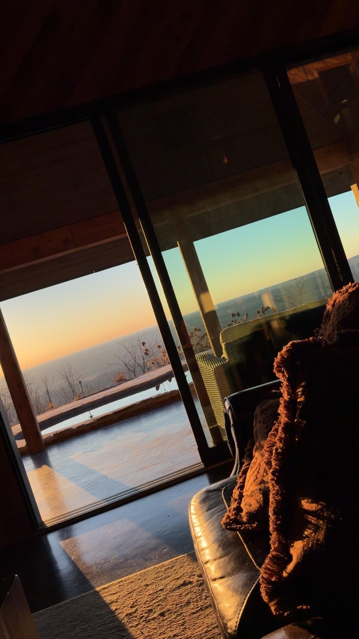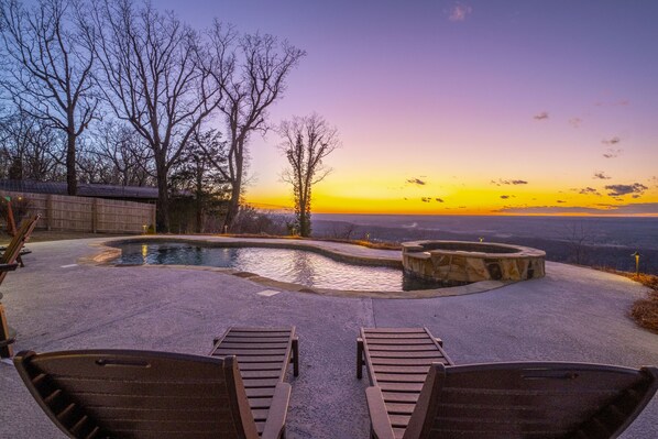 The amazing outdoor living space is so relaxing and peaceful. The minute you arrive at Tarbucks Hill, relaxation sets in. The cabin boasts a beautiful front porch complete with rocking chairs. It offers a pool and hot tub overlooking the brow. There are two outdoor fireplaces one on the covered back porch. There is a small playground for the kids to enjoy. You will find plenty of outdoor seating for relaxation with views and sunsets that will make you never want to leave.