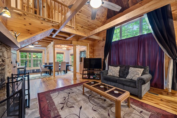 Hjemmet tilbyr et 2 1/2 etasjers hvelvet tak Great Room, kjøkkenkrok og kjøkken med en øy, åpen stueplan og franske furuvegger og tregulv. Moderne fargede vegger er integrert i bad og kjøkken, og det er lagt fliser på gulvet i underetasjen. The Great Room har også en peis med stablet stein!