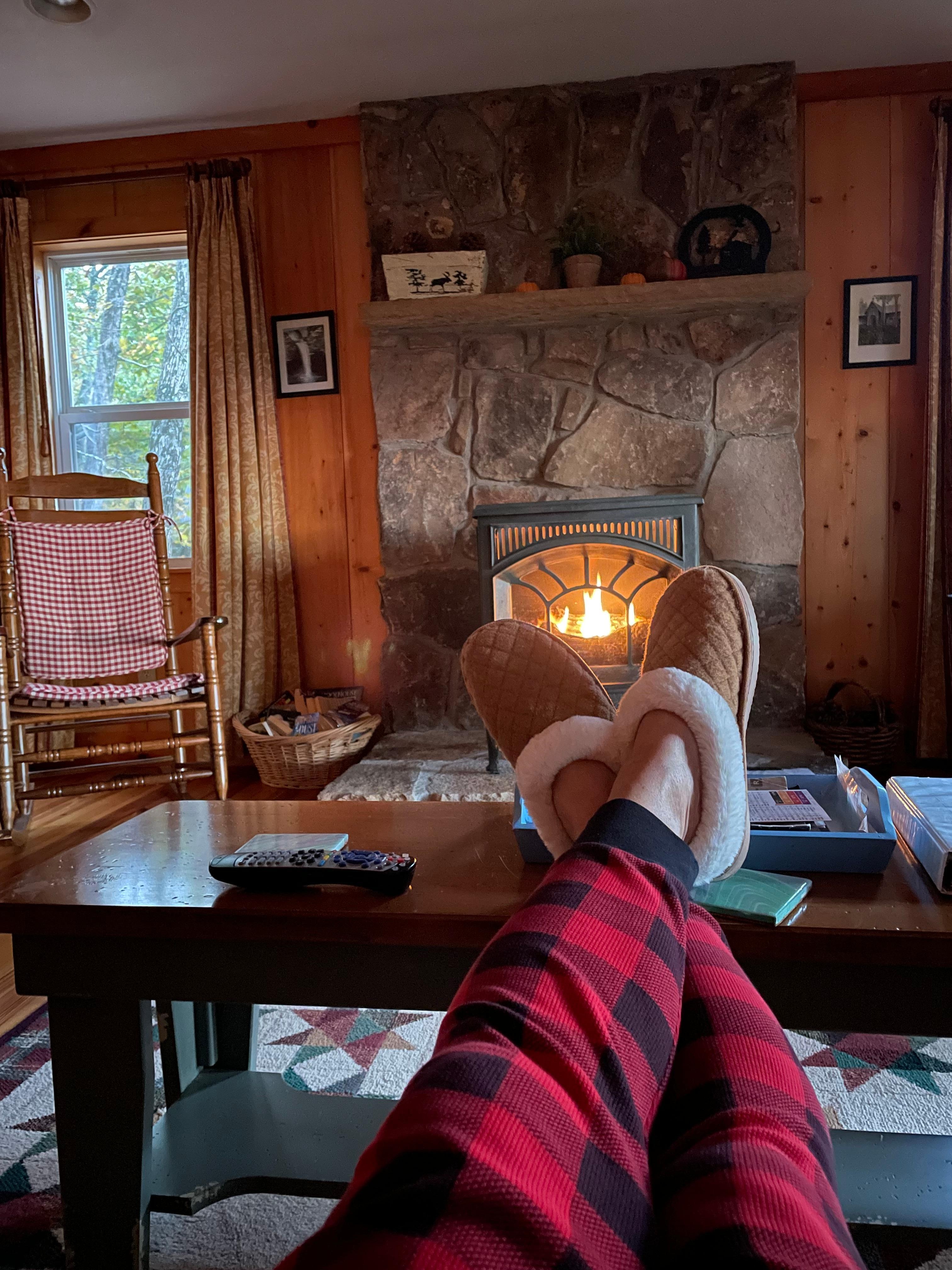 Familie, venner, eller bare dere to kan nyte den rustikke furupanel 'samling rom "der du kan lese bøker, spille kort eller brettspill, se på TV, eller kok opp noe er det fullt utstyrt kjøkken. På en kjølig dag nyte en brann i gass logge komfyr på stein ildsted. Det er en liten stein uteplass med en kullgrill for cookouts.