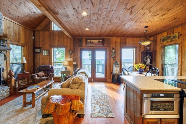 Beautiful living room with a wood-burning fireplace, smart TV, and high-speed Wi-Fi.