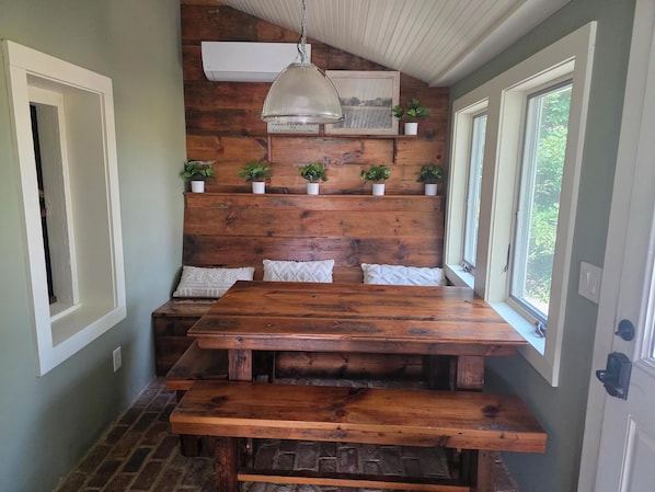 The thick stone walls offer natural insulation and a quiet, calming atmosphere. Step out onto the back porch to soak in sweeping views of the creek and surrounding farmland.