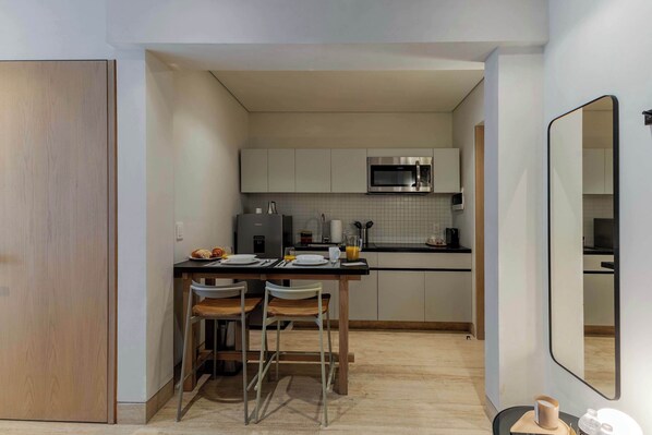 Step into a haven of luxury and comfort in our beautifully designed apart-studio. The sophisticated design creates an inviting atmosphere, enhanced by a private balcony where you can savor fresh air. Enjoy the convenience of a fully equipped kitchen, perfect for cooking enthusiasts. The apartment also features efficient air conditioning to keep you cool and comfortable. Unwind in this elegant space, which provides everything you need for a truly luxurious experience.