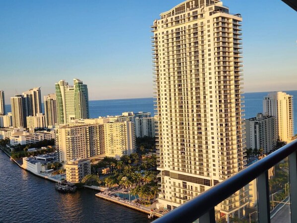 El apartamento tiene acceso a una espectacular piscina sobre la intercostal, desde donde podrá disfrutar de una vista de barcos más grandes de Miami navegando por este bello canal.