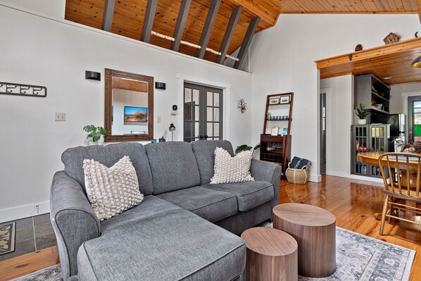 The fully equipped open galley kitchen is highlighted by top-of-the-line appliances, including a Bosch dishwasher, and cherrywood cabinets. Do we say "ooh-la-la"? Yep, we do! When you and your guests want to gather for a formal meal, there’s a sweet dining table out in the 3-season porch area where you can enjoy whatever marvelous meal gets prepared. Guests love the stained-glass window decor and artisan craftsmanship that’s on obvious display throughout the cottage, reminiscent of the work of Frank Lloyd Wright. Uh-huh, we think you’ll be tickled, too.