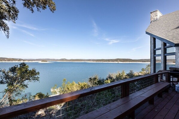 The lake in front of our house is down to 14 feet. You will have beautiful views from your deck of the hills across the lake. It is a short drive to the town of Lakehills for restaurant choices and entertainment options. We have the best of both worlds with peace and quiet, country living and comforts of home, but can still get to San Antonio outskirts in 30 minutes.