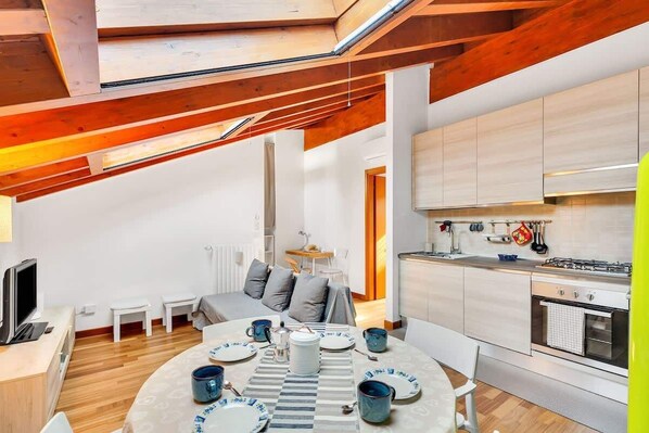 Air conditioning and Wi-Fi throughout the apartment, as well as a smart TV.