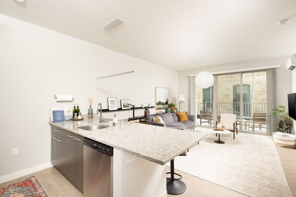 Enjoy an open concept floor plan, private balcony, and modern appliances in this new construction one bedroom apartment. The space comfortably sleeps two with a queen bed and has flexible seating areas so you can work or relax at your convenience. The living room sectional may serve as additional sleeping space, however please note it does not have a pull-out bed.