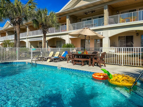 The Blue Crab has access to a pool, private to Spyglass Townhomes. Just grab a few towels and floaties and head to the sunchairs for sand-free water fun! The outdoor dining table seats 6 and comes with an umbrella - perfect for snacks in-between swims.