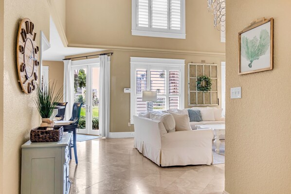 Ved innreise blir du møtt med en vakker foajé med marmorgulv og høye tak. Du går inn i stuen hvor det er rikelig med sitteplasser og en enorm flatskjerm T. V., du har tilgang til terrassen gjennom de franske dørene. Det er en våt bar i stuen for å underholde.