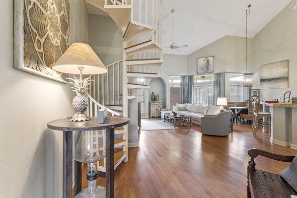 We enjoyed staying at this property. It's very close to the pool, has a nice view of the golf course, and is a somewhat short walk or drive to the beach. There are quite a few stairs though - up to the front door, just inside the front door, and to the upstairs loft/bunkbed room. We got used to them but they made move in and move out more challenging. Overall, a nice area to stay in.