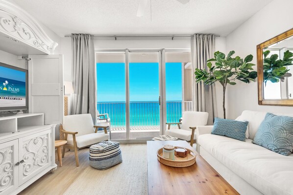 Når du kommer inn i dette nyrenoverte leilighet med 2 soverom, 2 bad i Destin, kan du gå rett til stue og spisestue, og ta den fantastiske utsikten over den sukkerholdige, myke hvite sanden og det smaragdgrønne vannet i Mexicogolfen. Den oppdaterte stuen har en HDTV samt tilgang til den private balkongen med lenestoler. Kjøkkenet er fullt utstyrt med alt du trenger for å tilberede et familiemåltid og har benkeplater av kvarts og apparater i rustfritt stål. Master king-suiten tilbyr HDTV og privat bad med doble forfengelighet. Det andre soverommet er et køyeseng med to enkeltsenger over to køyesenger, og HDTV, og et tilknyttet bad. Hvert soverom er innredet i nautiske farger som er perfekte for en strandferie. Dette feriehusleiligheten tilbyr vaskemaskin og tørketrommel i enheten og kan lett huse opptil 6 gjester.